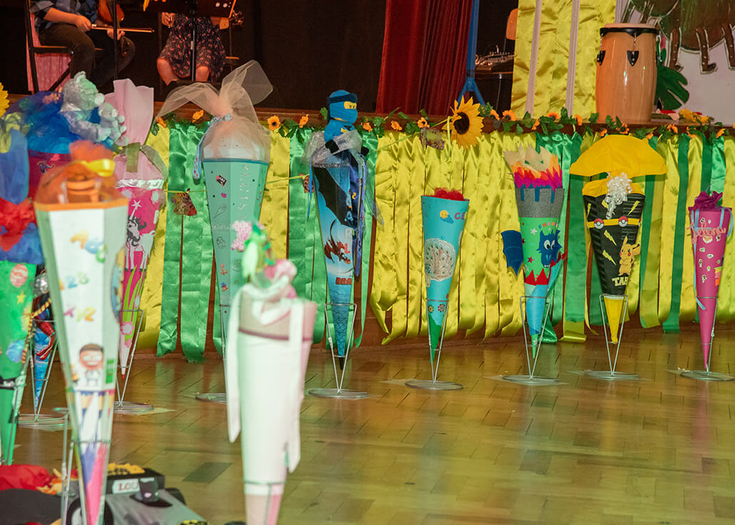 Gerahmt vom feierlichen Bühnenprogramm haben all unsere stolzen Erstklässler:innen an unserer Kreativitätsgrundschulen mit leuchtenden Augen ihre Schultüten bekommen.